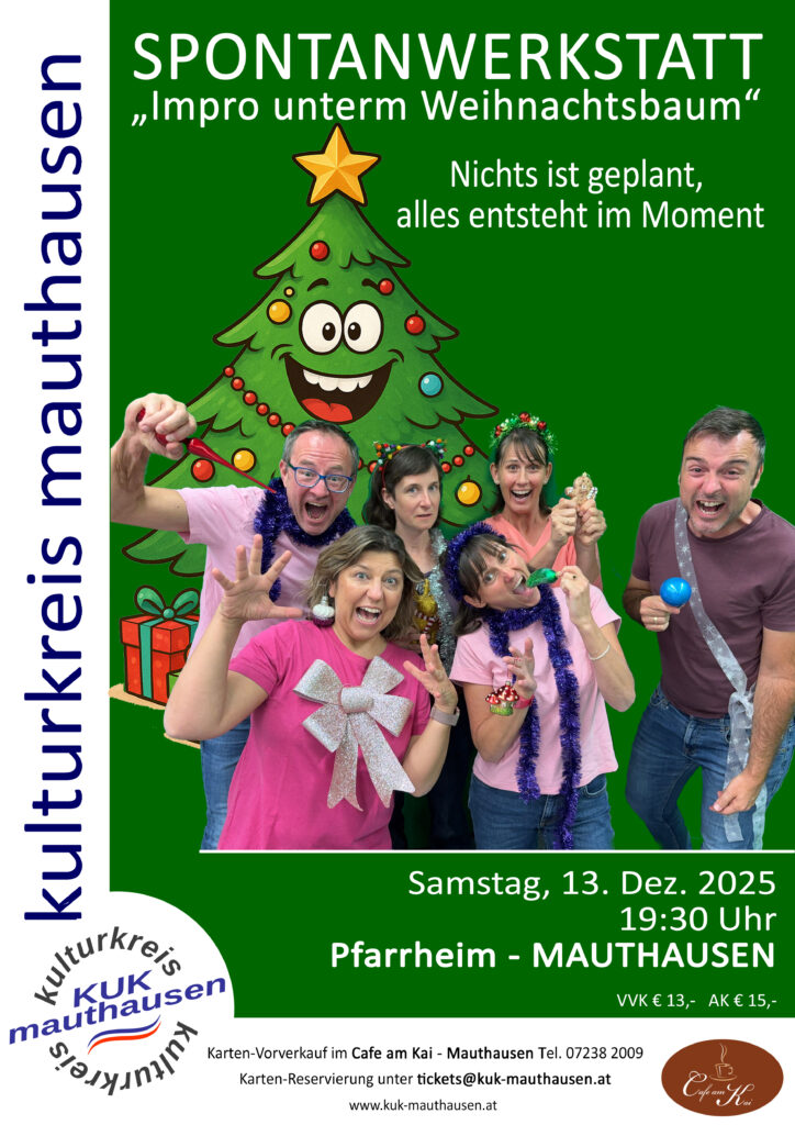 Die Spontanwerkstatt improvisiert Weihnachtliches. Das Ensemble schenkt dem Publikum einen Abend voller spontaner Geschichten, überraschender Wendungen und herzhaftem Lachen – alles inspiriert von den Ideen der Zuschauer. Nichts ist geplant, alles entsteht im Moment.